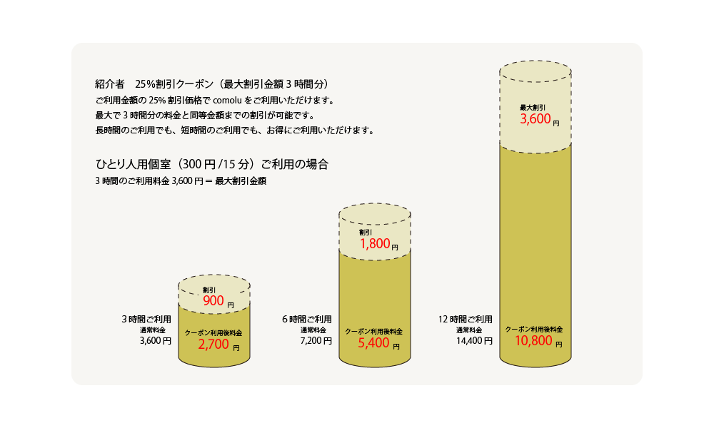 紹介プログラムで発行されたクーポンは、ご利用金額の25%割引価格でcomoluをご利用いただけます。