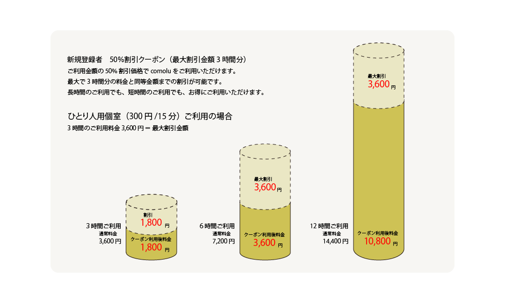 紹介プログラムで発行されたクーポンは、ご利用金額の50%割引価格でcomoluをご利用いただけます。